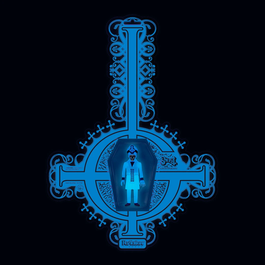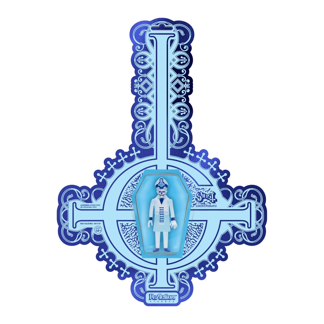 The collaboration between Super7 and rockβs most mysterious band Ghost continues with the Ghostferatu glow-in-the dark 3.75β ReAction figure! Inspired by the cover art from the bandβs 2013 If You Have Ghost EP, the Ghosferatu figure is glow-in-the-dark translucent blue on a beautifulΒ foil embossed Grucifix card.