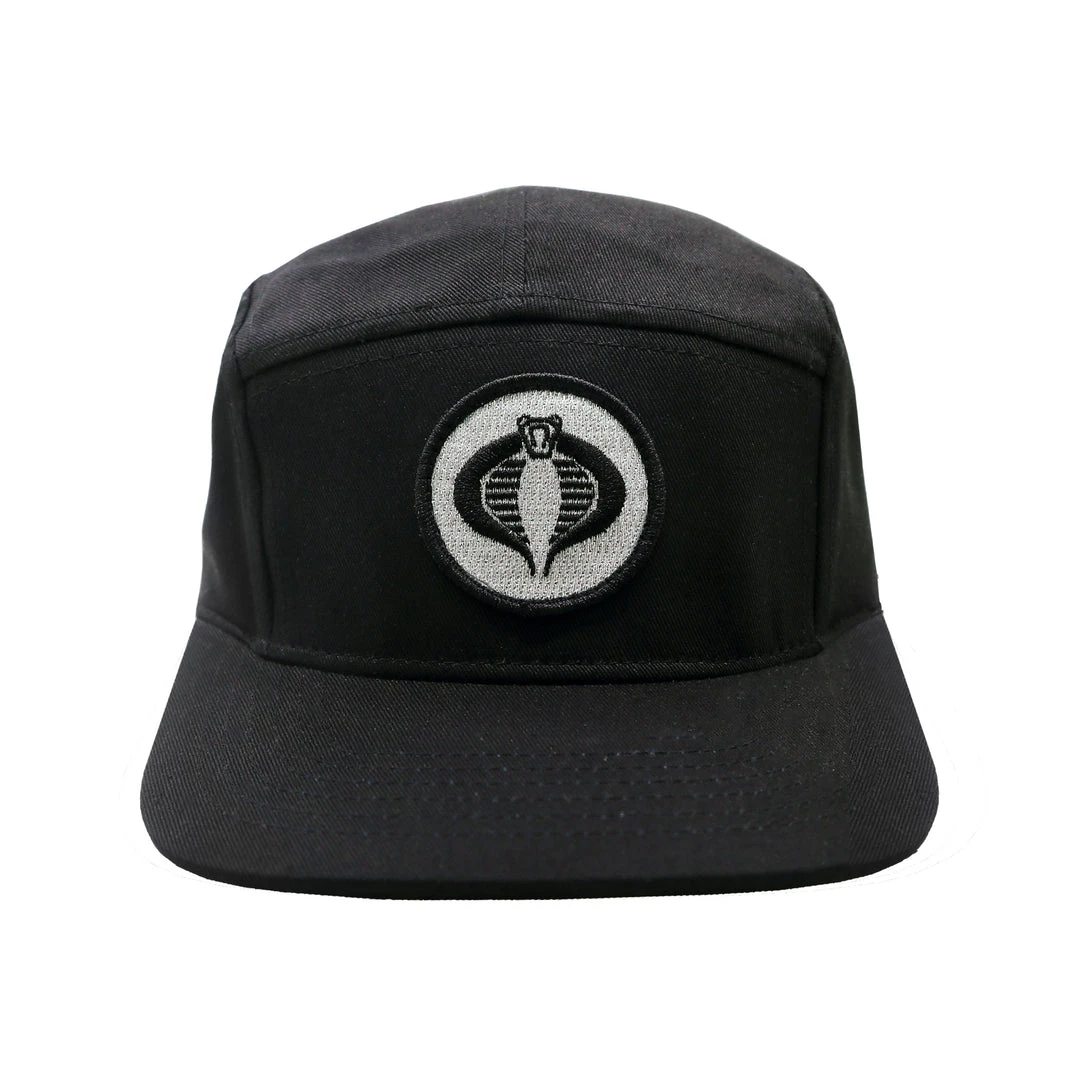 Cobra Snakelings report for duty! This black 5 panel hat features a 1.5” silver embroidered Cobra logo patch on front panel, one top stitched inner band label and Super7 flag label on back silver buckle. One size fits all.